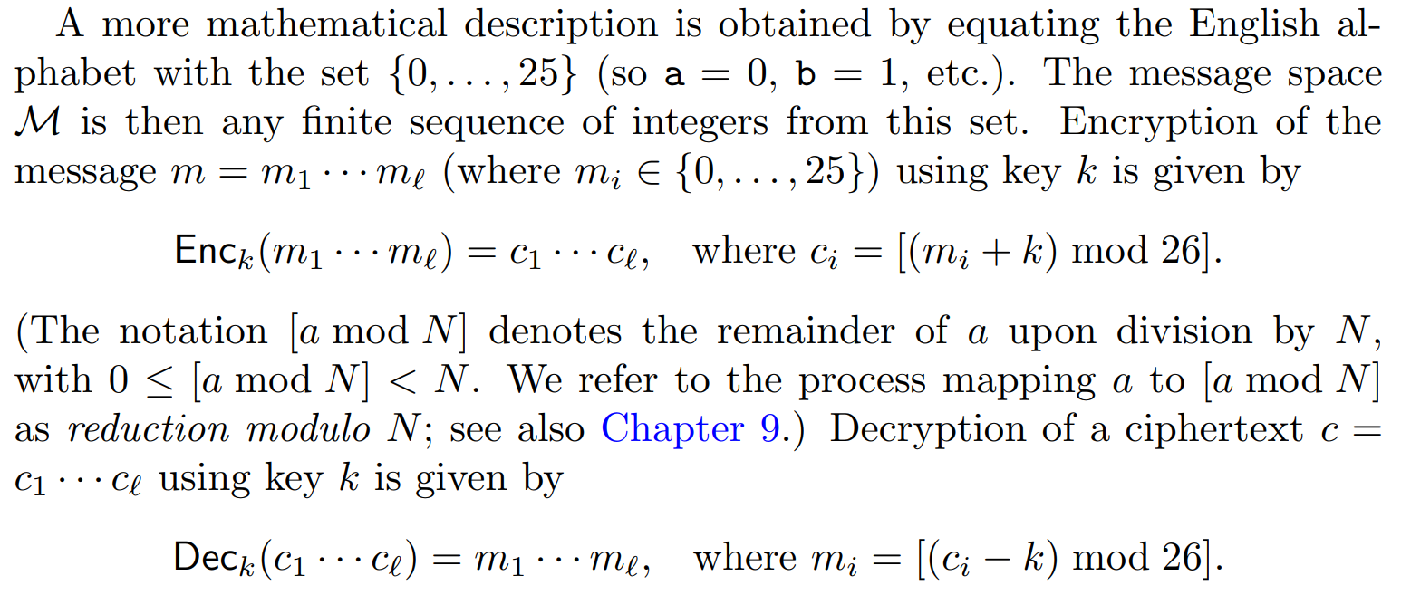 - algorithm Enc takes a key k and a plaintext and shifts each letter of the plaintext forward k positions (wrapping around at the end of the alphabet);
