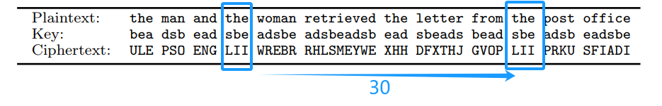 For example, consider the common word “the.” This word will be mapped to different ciphertext characters, depending on its position in the plaintext. However, if it appears twice in the same relative position, then it will be mapped to the same ciphertext characters. For a sufficiently long plaintext, there is thus a good chance that “the” will be mapped repeatedly to the same ciphertext characters.