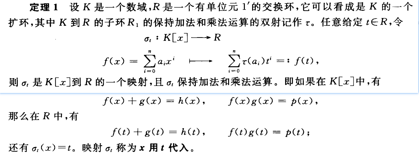 - 数域K到$R_1$有一个双射$\tau$,且$\tau$保持加法与乘法运算